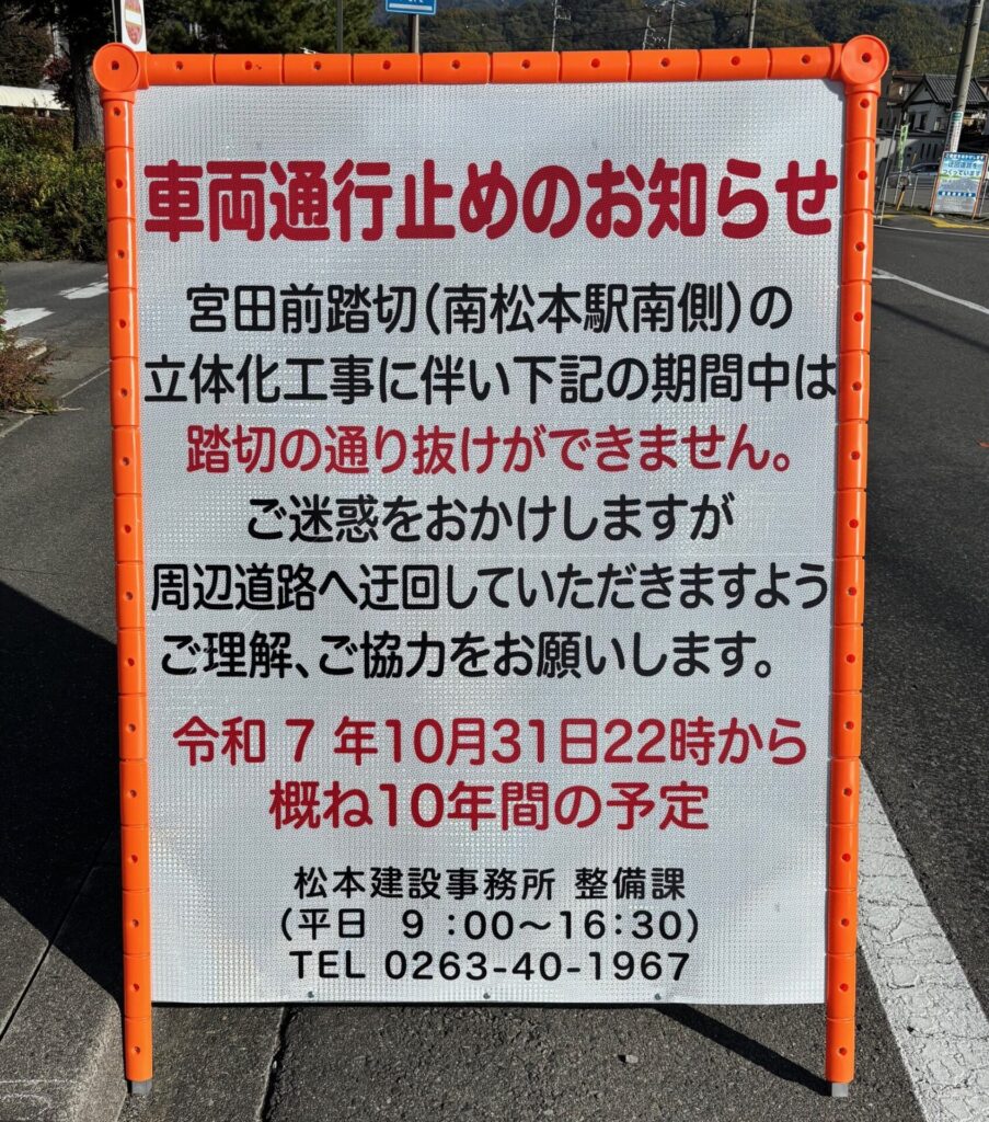 通勤時に普段利用している南松本駅南側の宮田前踏切が先月31日の22時から通り抜けが出来なくなりました。ここの踏切の遮断機が下りている時間が長い為、地元では『開かずの踏切』とも呼ばれていました。