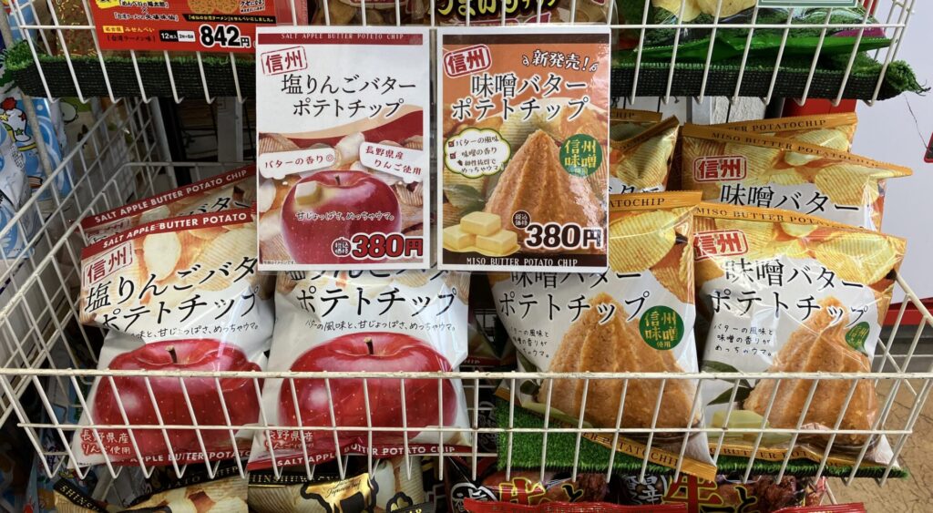 みなさん信州塩りんごバターポテトチップ、信州味噌バターポテトチップを是非2つセットでお土産として