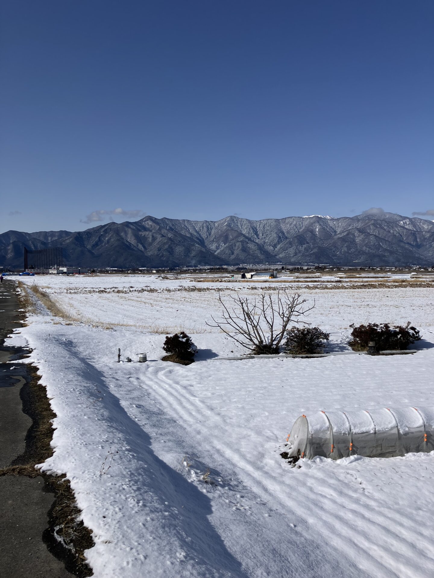 土曜日から日曜日のかけて降った雪で、田んぼ(畑)そこから見える山々が