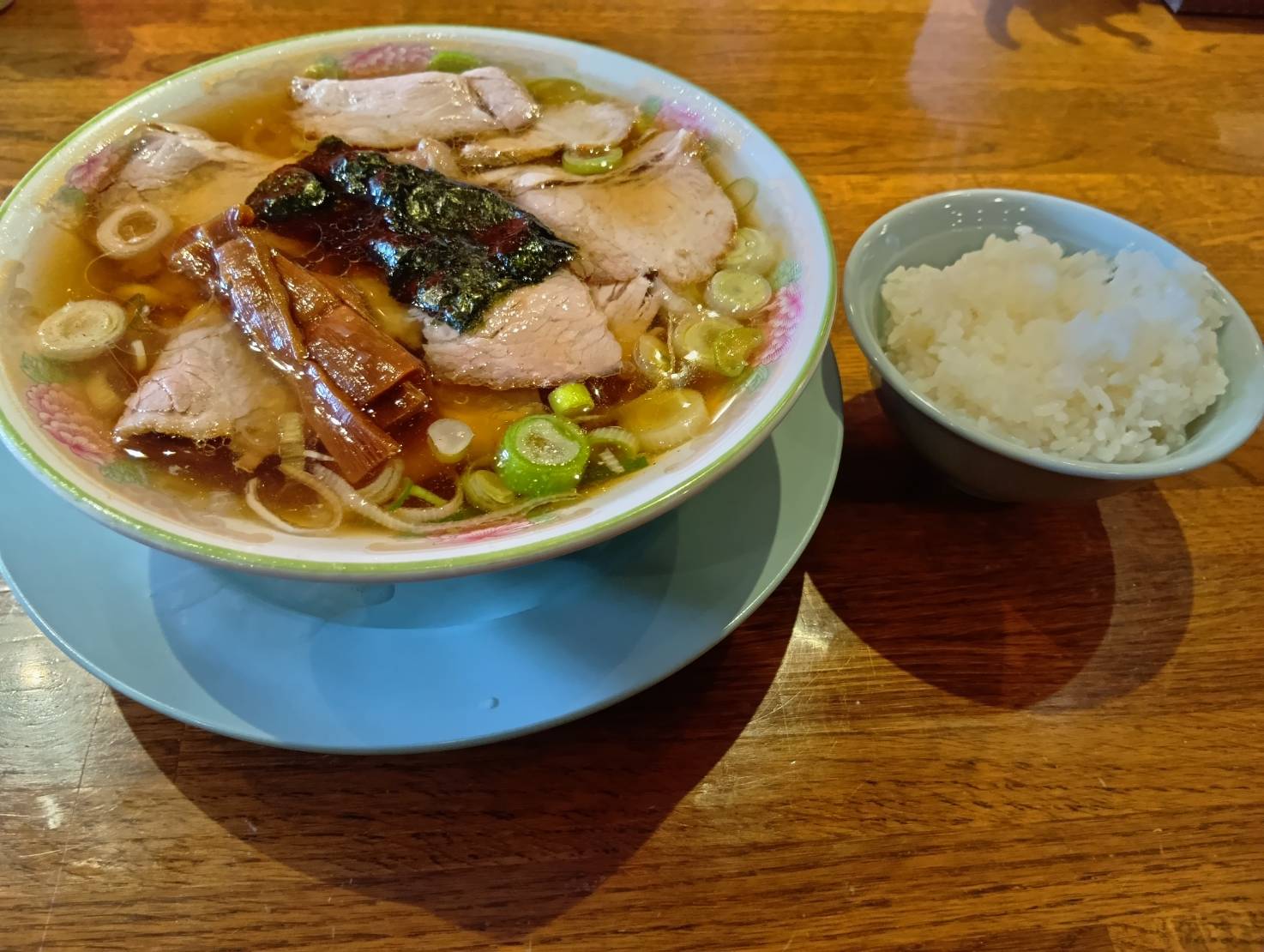 三味軒は何と1杯750円。しかもライス無料のおまけ付!普通の中華そばでもチャーチューが7枚ほど