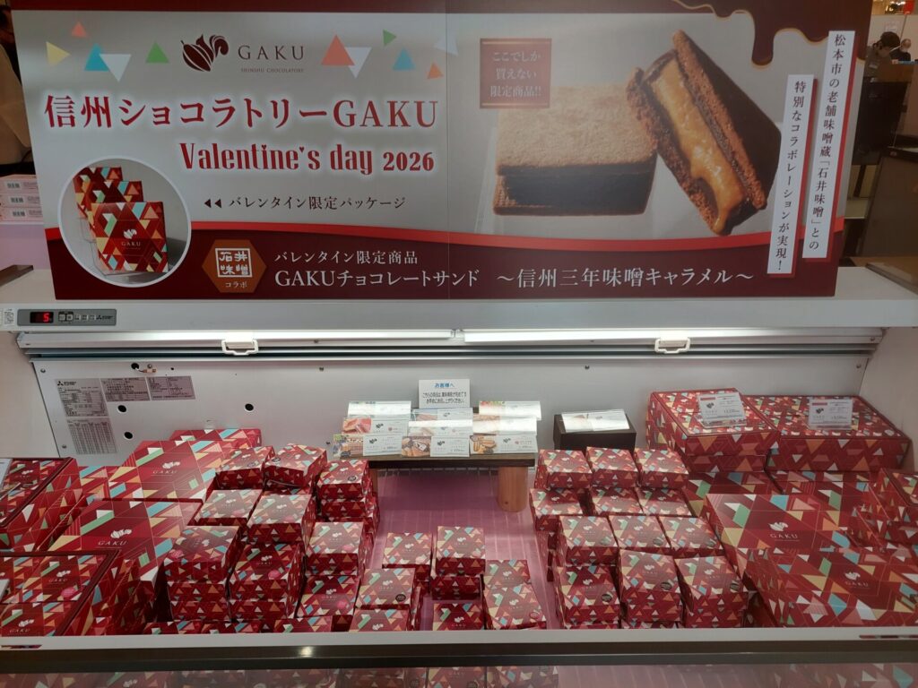信州素材に拘ったGAKUのバレンタインチョコ!! 今年は「石井味噌」様とコラボしたチョコレートサンド「信州三年味噌キャラメル」が新商品として登場!! バレンタイン限定商品となります。 アイシティでもバレンタインデーの催事に出店していました。 松... -
